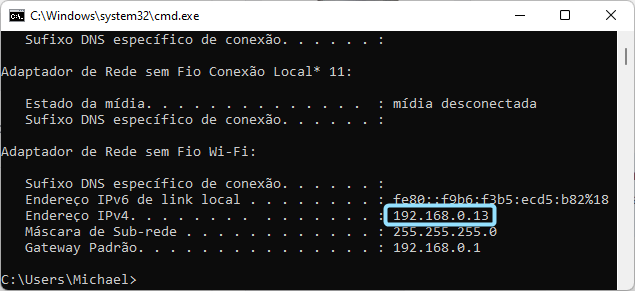 Pressione as teclas Windows + R no teclado. Na janela que abrir, digite CMD e clique em "OK". Na próxima tela, digite ipconfig e pressione Enter no teclado. Você verá um resultado semelhante ao mostrado na imagem abaixo.